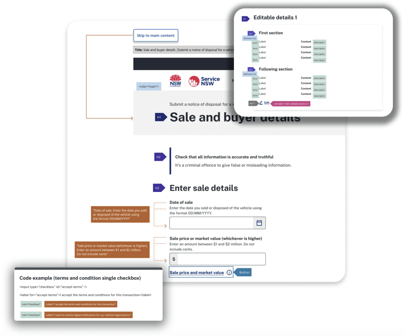 Every new or redesigned Service NSW transaction — including Online Licence Renewal, which I was also working on — would be built from the same TaPaaS component library and page templates. If I only annotated NoD, we would be solving the same problems again for each subsequent transaction. But if I used NoD as the reference case to define accessibility specifications at the design system level, every transaction that followed would inherit correct accessible behaviour from the ground up.