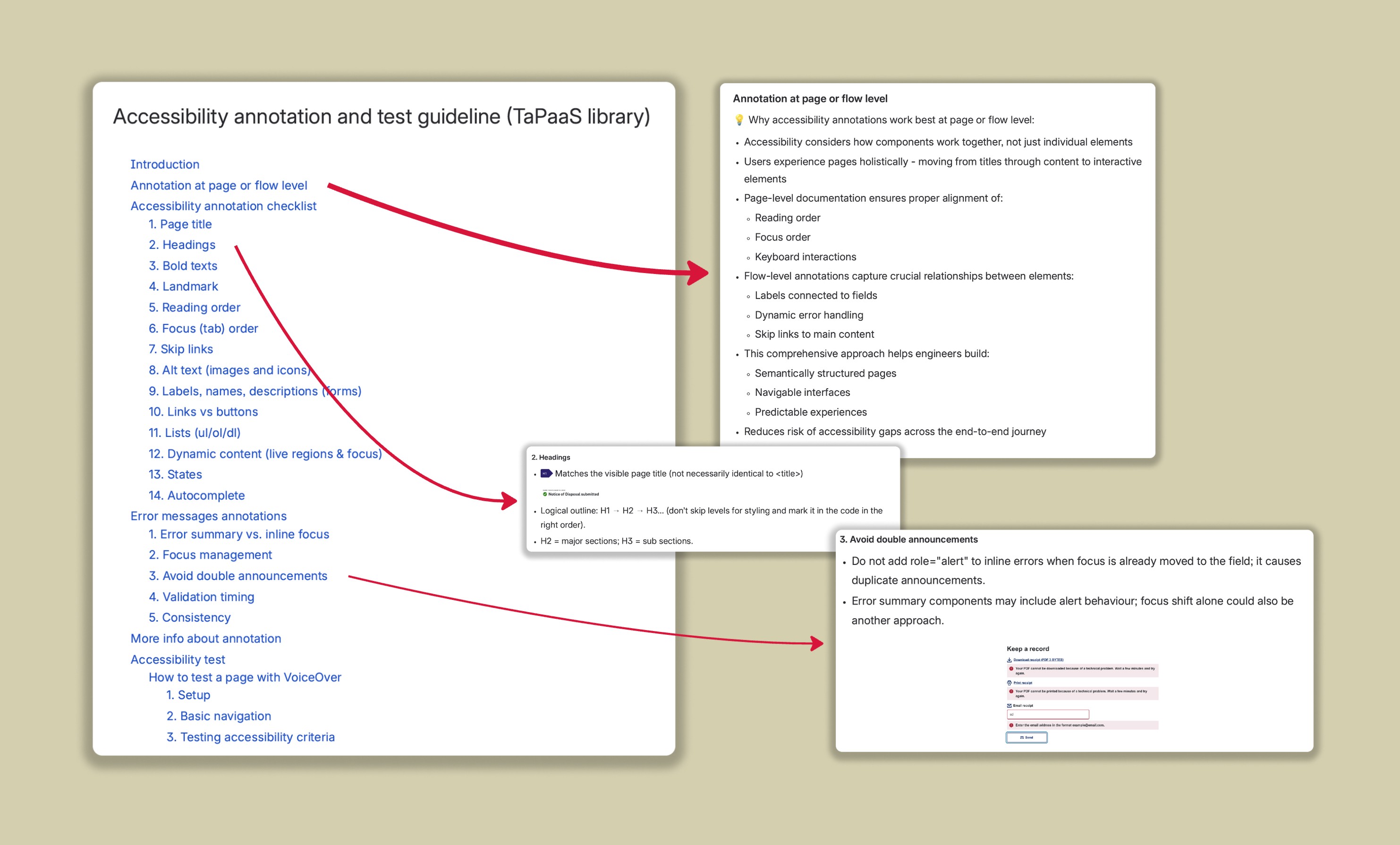 The outcome of those sessions became the error messages annotation section of the guideline — five specific rules covering error summary vs. inline focus, focus management, avoiding double announcements, validation timing, and the importance of consistency across all pages in a flow. The principle we landed on was deliberate: consistency beats clever case-by-case solutions. Picking one pattern and applying it throughout a flow is better for users and simpler for engineers than optimising each page independently.